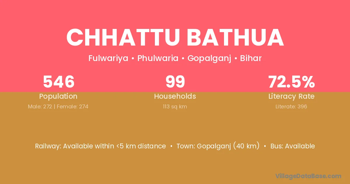 Gopalganj (40 km) is the nearest town to Chhattu Bathua village for major economic activities and is located approximately 40 km away.