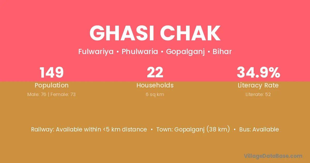 Ghasi Chak village has a total population of 149 people, of which 76 are males and 73 are females.