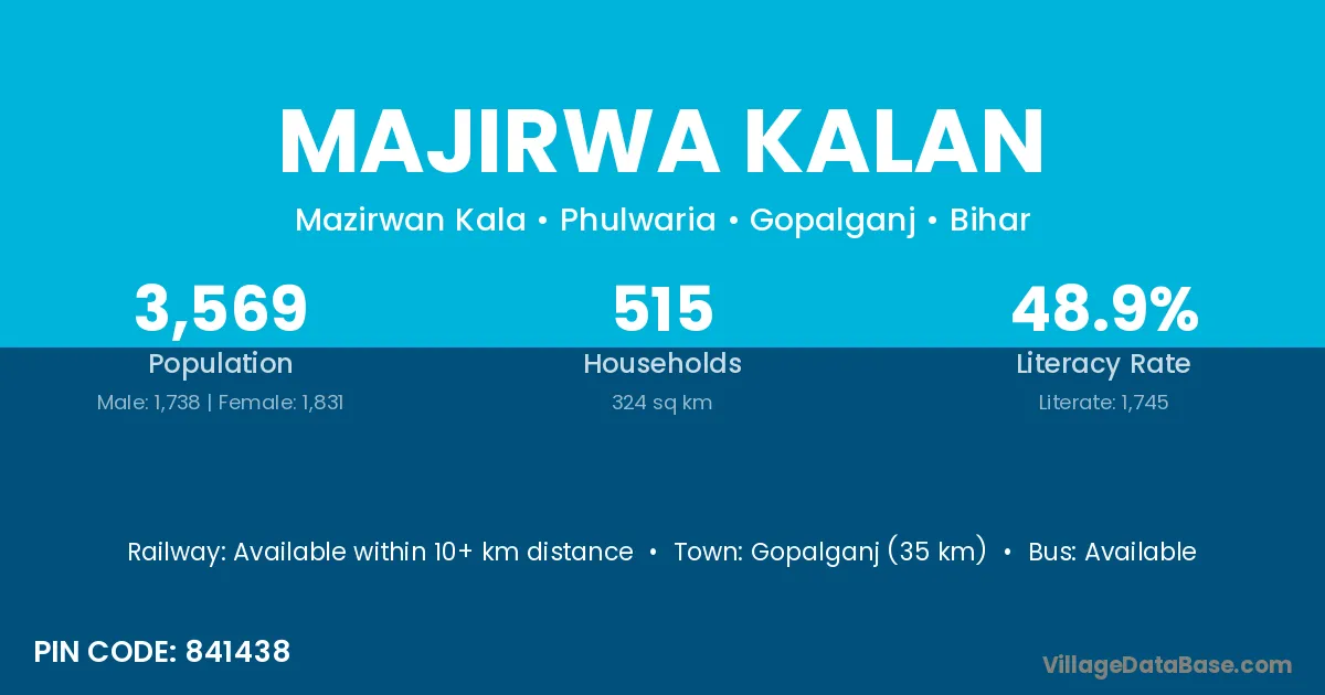 Gopalganj (35 km) is the nearest town to Majirwa Kalan village for major economic activities and is located approximately 35 km away.