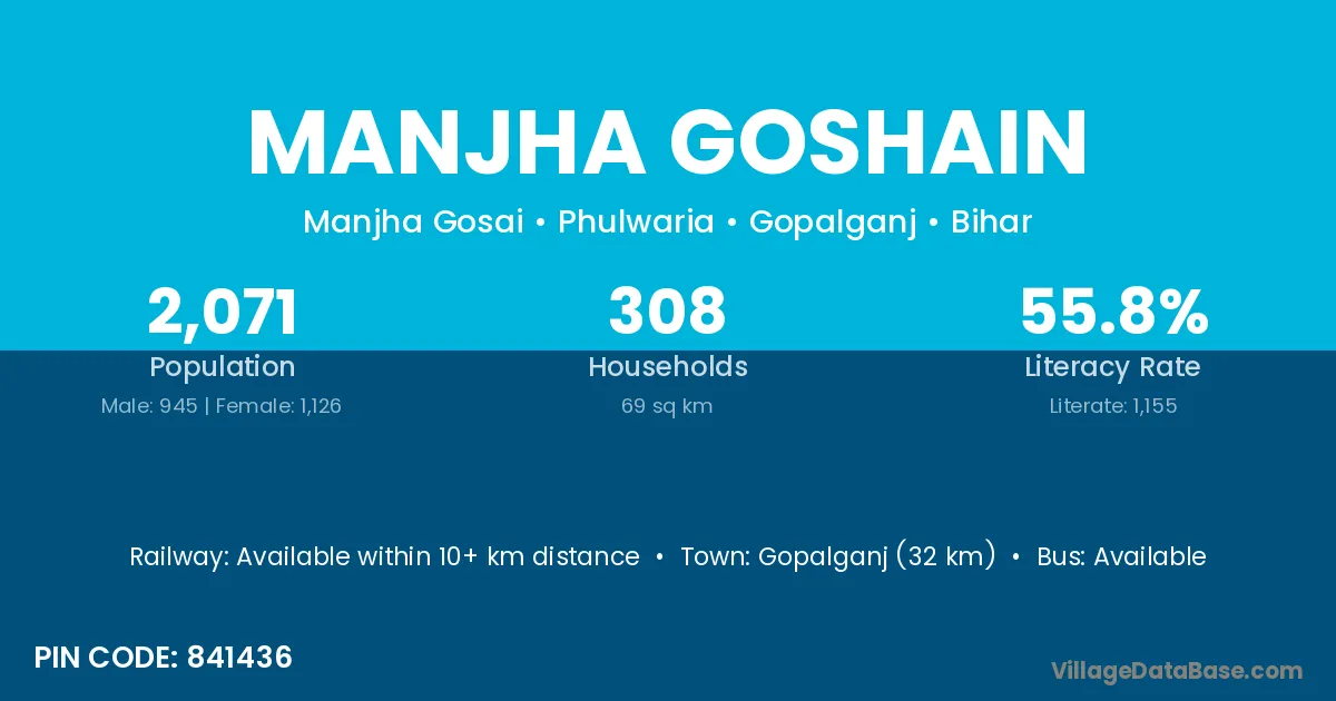 Gopalganj (32 km) is the nearest town to Manjha Goshain village for major economic activities and is located approximately 32 km away.