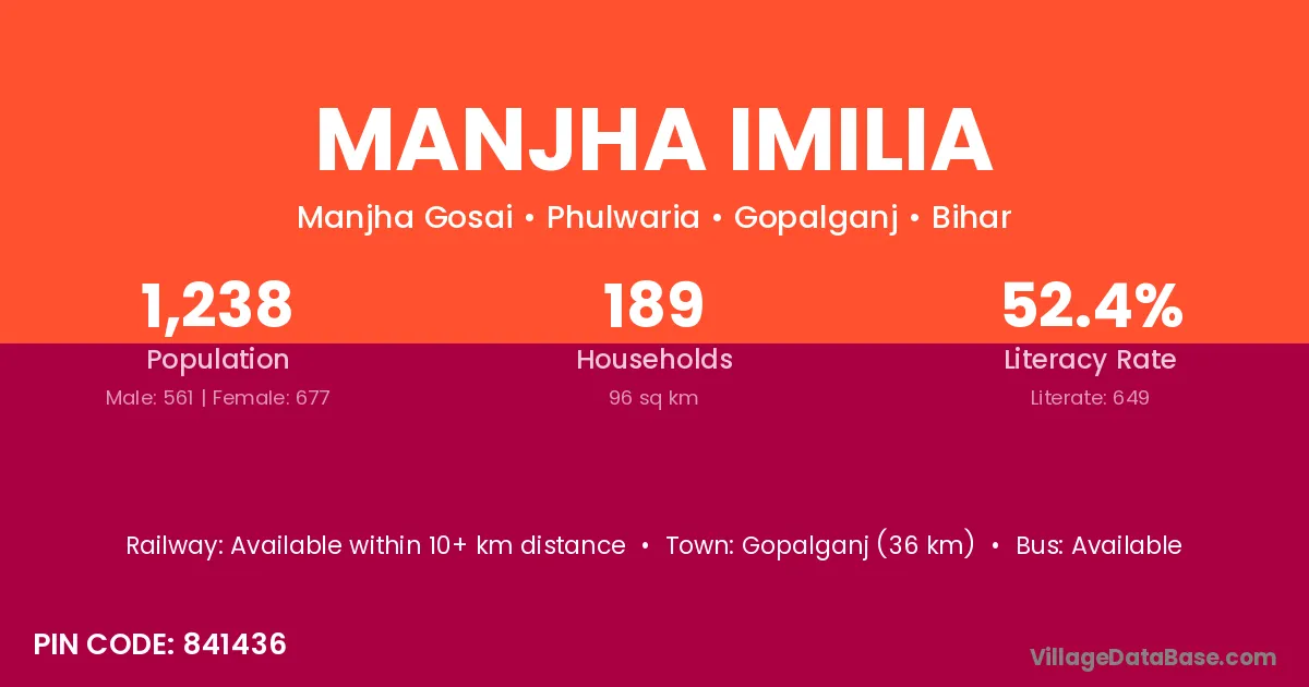 Gopalganj (36 km) is the nearest town to Manjha Imilia village for major economic activities and is located approximately 36 km away.