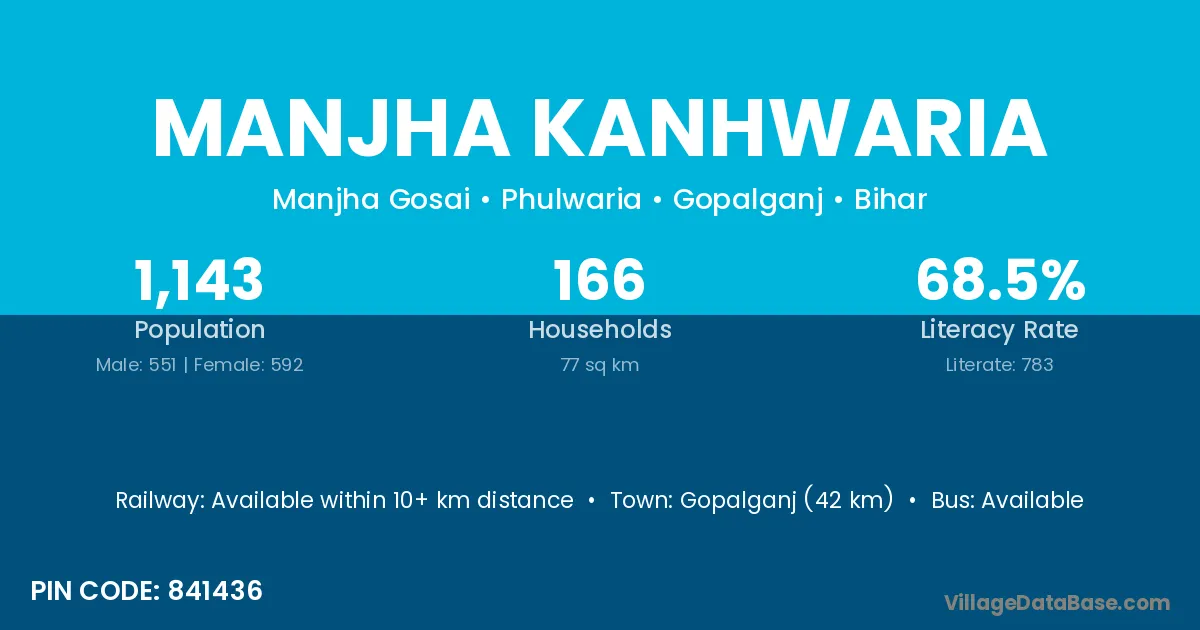 Gopalganj (42 km) is the nearest town to Manjha Kanhwaria village for major economic activities and is located approximately 42 km away.