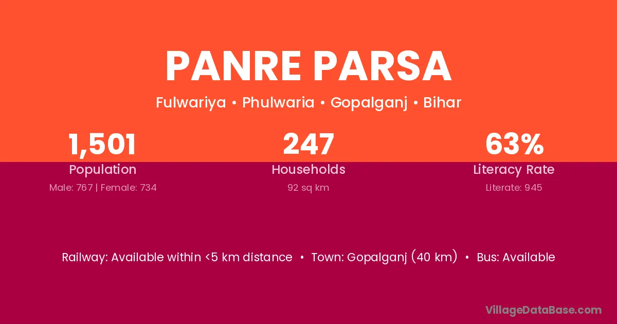 Gopalganj (40 km) is the nearest town to Panre Parsa village for major economic activities and is located approximately 40 km away.