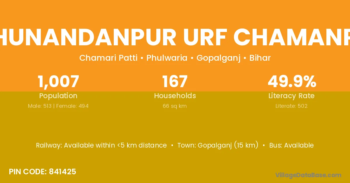 Raghunandanpur Urf Chamanpatti village has a total population of 1,007 people, of which 513 are males and 494 are females.