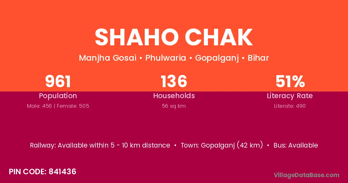 Gopalganj (42 km) is the nearest town to Shaho Chak village for major economic activities and is located approximately 42 km away.