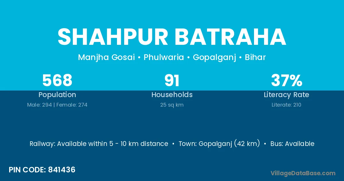 Gopalganj (42 km) is the nearest town to Shahpur Batraha village for major economic activities and is located approximately 42 km away.