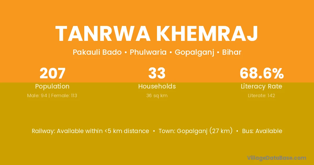 Gopalganj (27 km) is the nearest town to Tanrwa Khemraj village for major economic activities and is located approximately 27 km away.