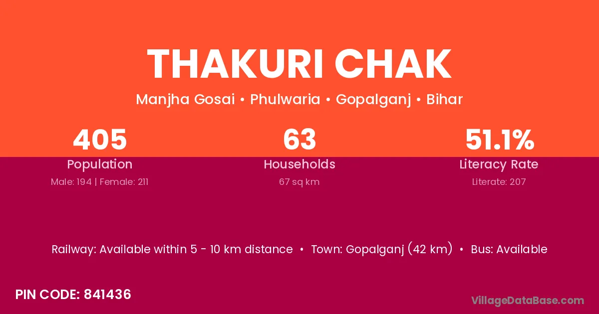 Gopalganj (42 km) is the nearest town to Thakuri Chak village for major economic activities and is located approximately 42 km away.