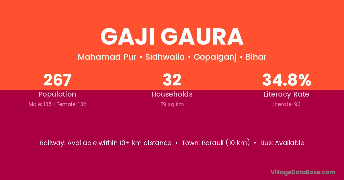 Barauli (10 km) is the nearest town to Gaji Gaura village for major economic activities and is located approximately 10 km away.
