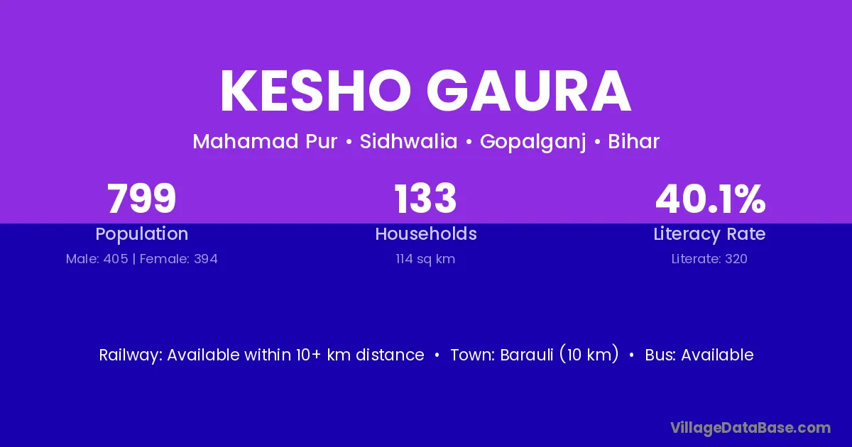 Barauli (10 km) is the nearest town to Kesho Gaura village for major economic activities and is located approximately 10 km away.