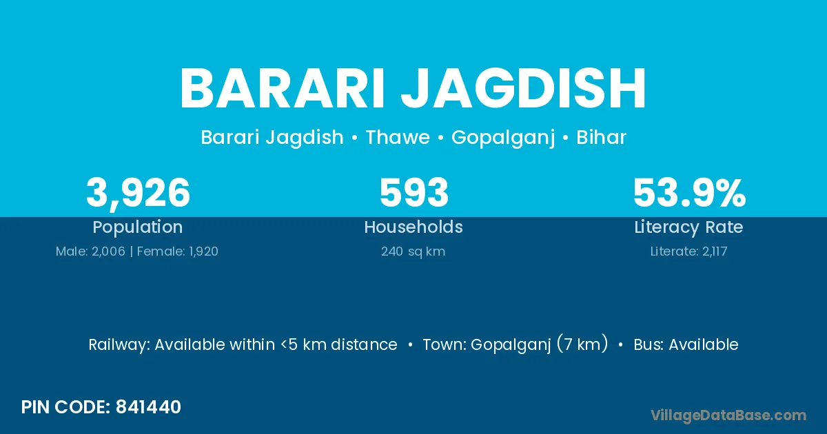Gopalganj (7 km) is the nearest town to Barari Jagdish village for major economic activities and is located approximately 7 km away.