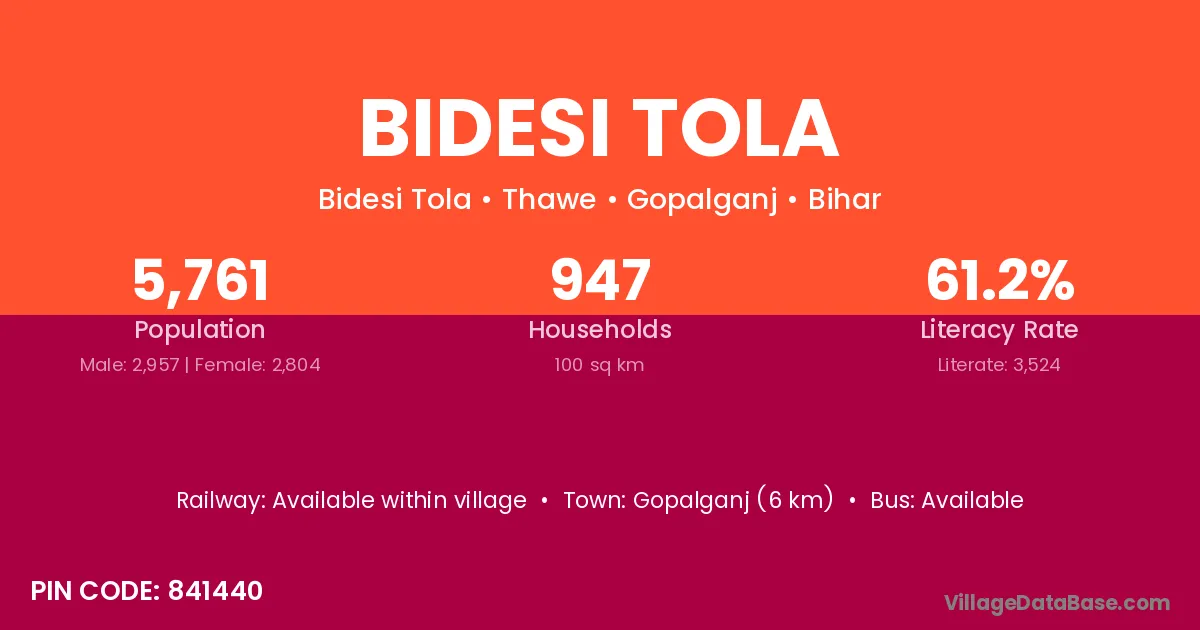 Bidesi Tola village has a total population of 5,761 people, of which 2,957 are males and 2,804 are females.