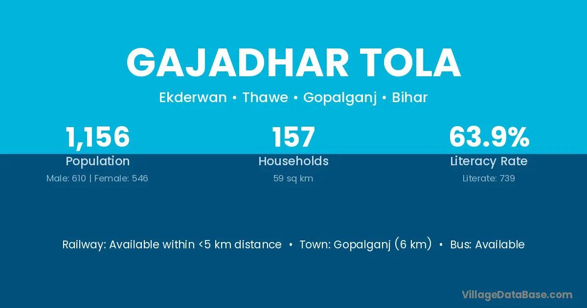 Gajadhar Tola village has a total population of 1,156 people, of which 610 are males and 546 are females.