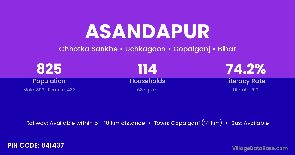 Gopalganj (14 km) is the nearest town to Asandapur village for major economic activities and is located approximately 14 km away.