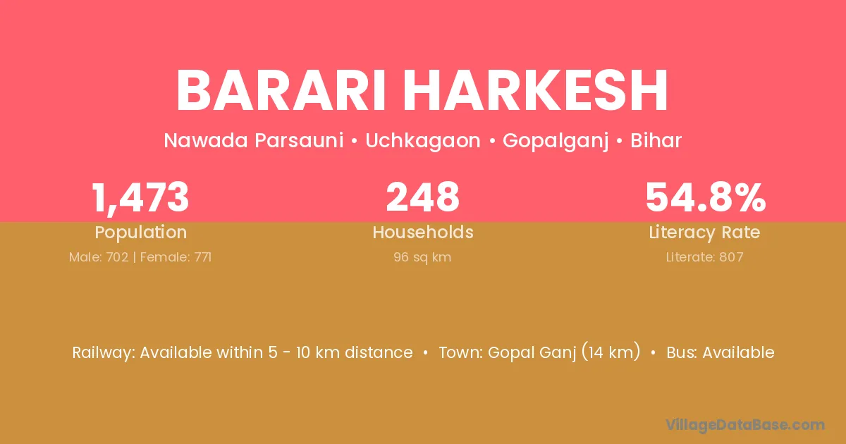 Gopal Ganj (14 km) is the nearest town to Barari Harkesh village for major economic activities and is located approximately 14 km away.