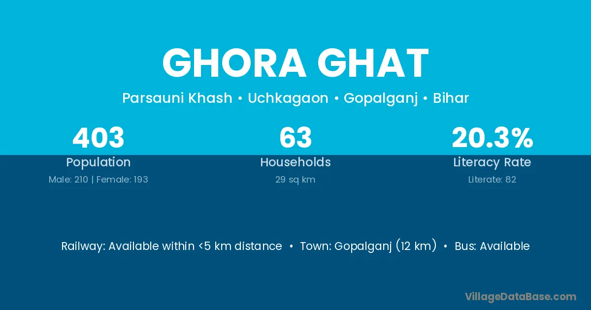 Ghora Ghat village has a total population of 403 people, of which 210 are males and 193 are females.