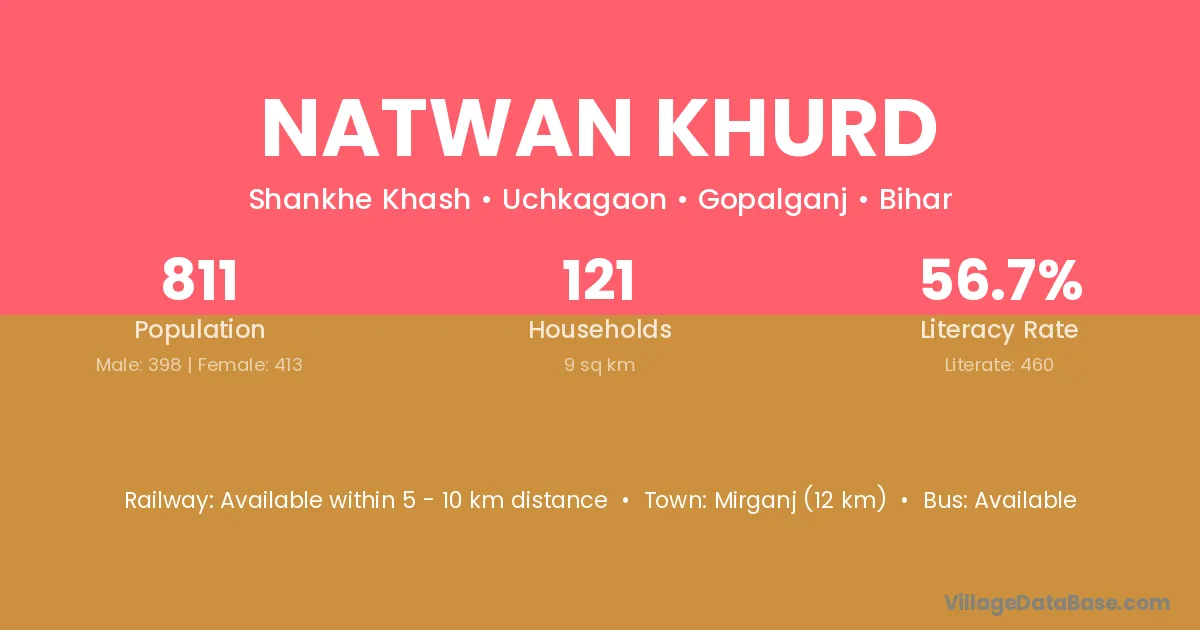 Mirganj (12 km) is the nearest town to Natwan Khurd village for major economic activities and is located approximately 12 km away.
