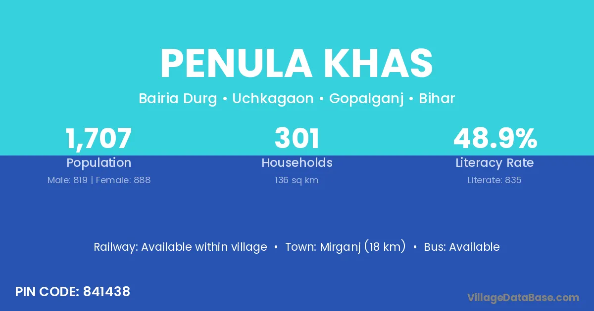 Mirganj (18 km) is the nearest town to Penula Khas village for major economic activities and is located approximately 18 km away.