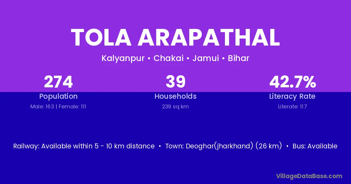 Deoghar(jharkhand) (26 km) is the nearest town to Tola Arapathal village for major economic activities and is located approximately 26 km away.