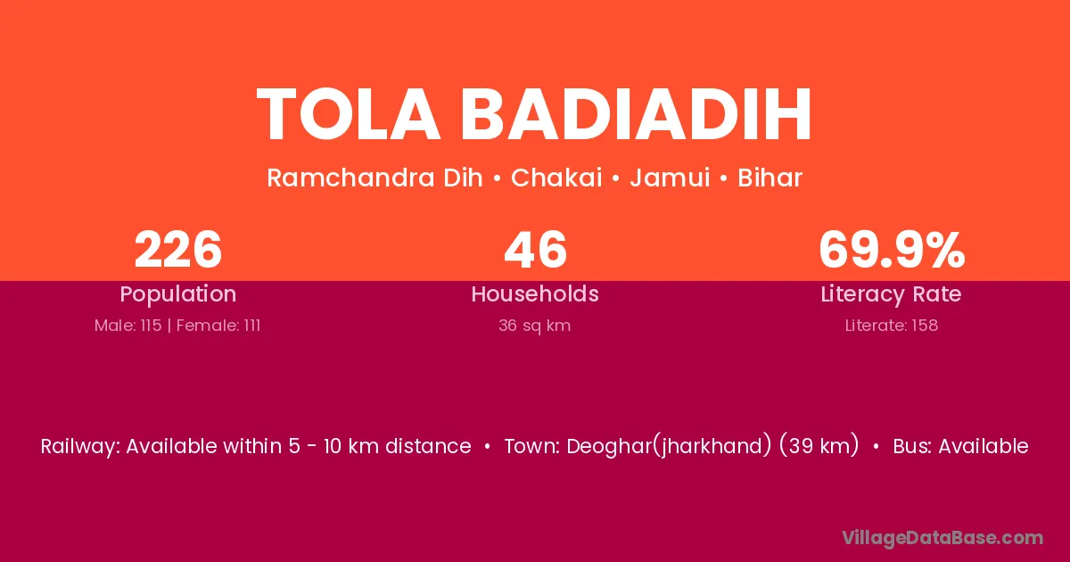Deoghar(jharkhand) (39 km) is the nearest town to Tola Badiadih village for major economic activities and is located approximately 39 km away.
