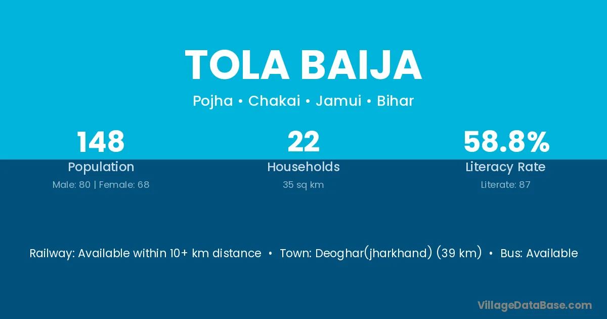 Deoghar(jharkhand) (39 km) is the nearest town to Tola Baija village for major economic activities and is located approximately 39 km away.