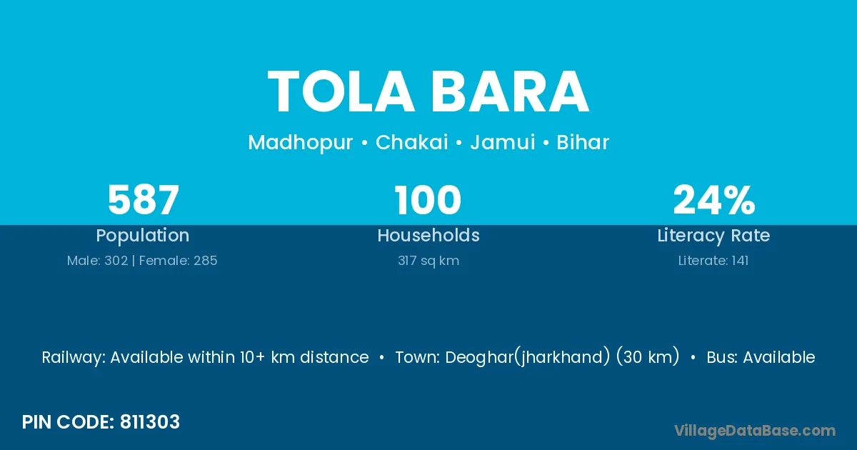 Deoghar(jharkhand) (30 km) is the nearest town to Tola Bara village for major economic activities and is located approximately 30 km away.