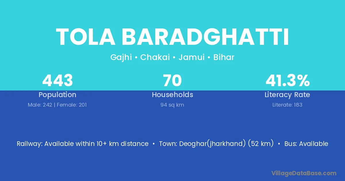 Tola Baradghatti village has a total population of 443 people, of which 242 are males and 201 are females.