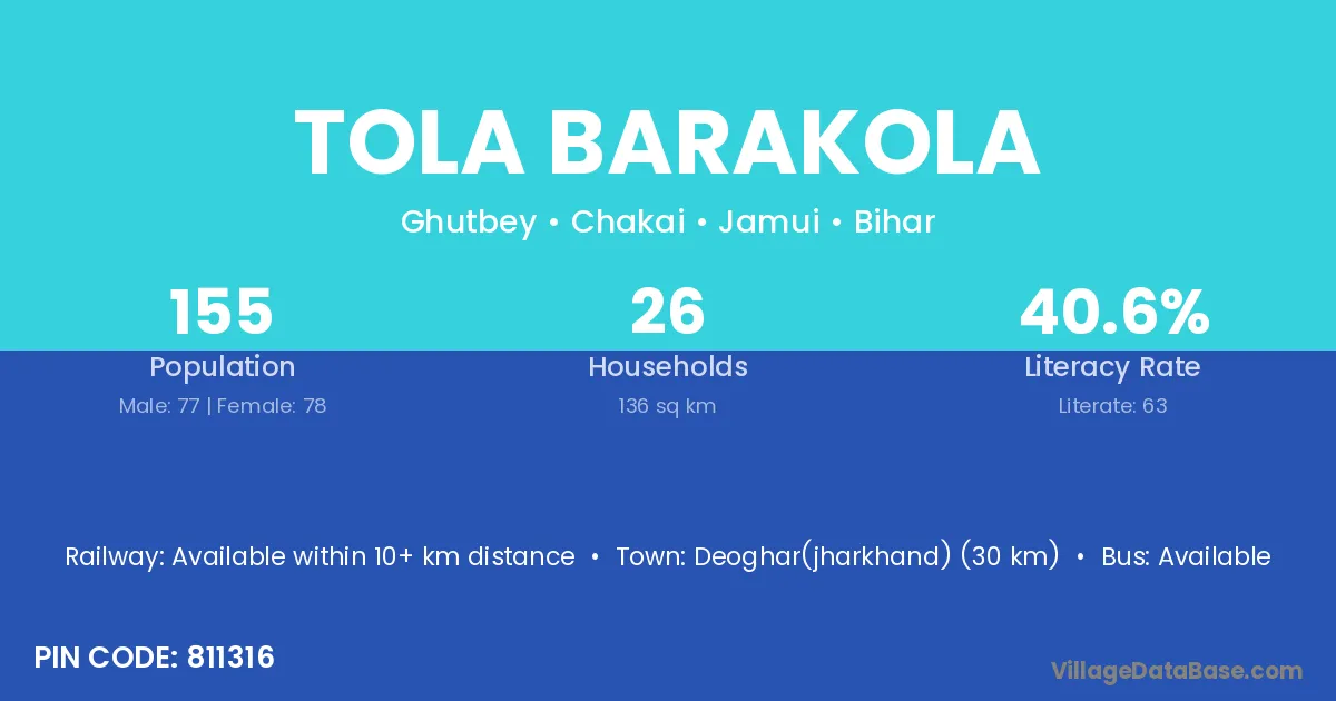 Deoghar(jharkhand) (30 km) is the nearest town to Tola Barakola village for major economic activities and is located approximately 30 km away.