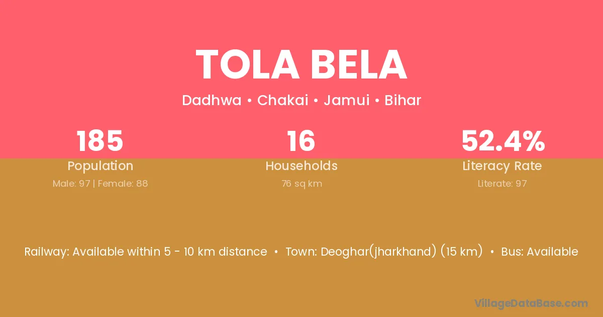 Deoghar(jharkhand) (15 km) is the nearest town to Tola Bela village for major economic activities and is located approximately 15 km away.