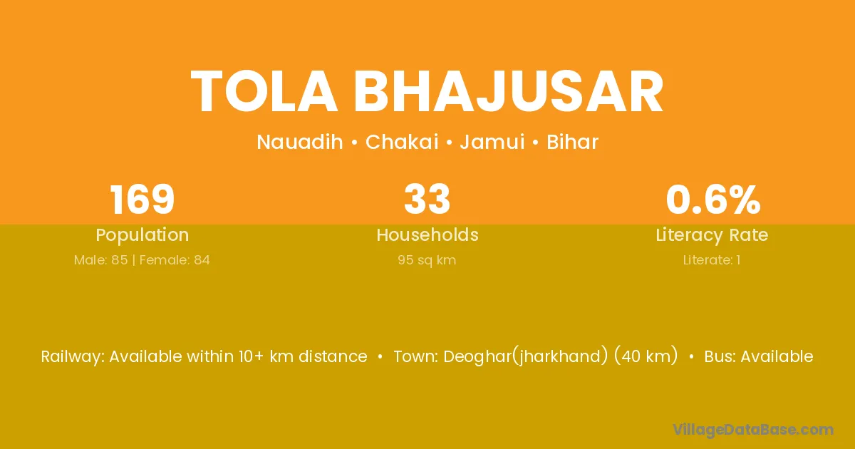 Deoghar(jharkhand) (40 km) is the nearest town to Tola Bhajusar village for major economic activities and is located approximately 40 km away.