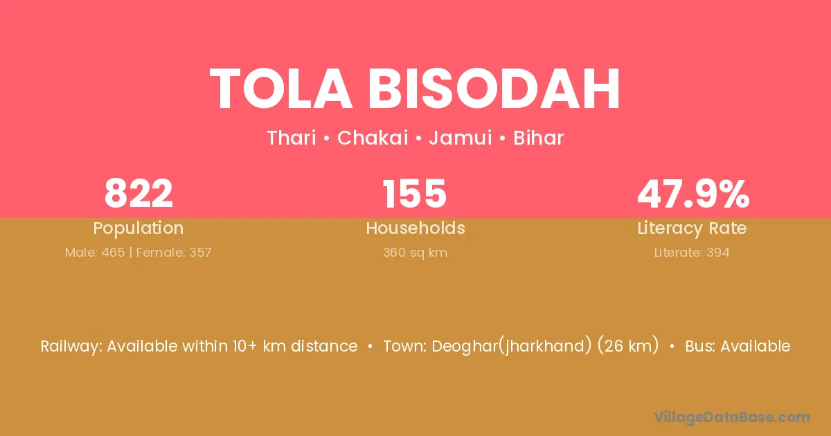 Deoghar(jharkhand) (26 km) is the nearest town to Tola Bisodah village for major economic activities and is located approximately 26 km away.