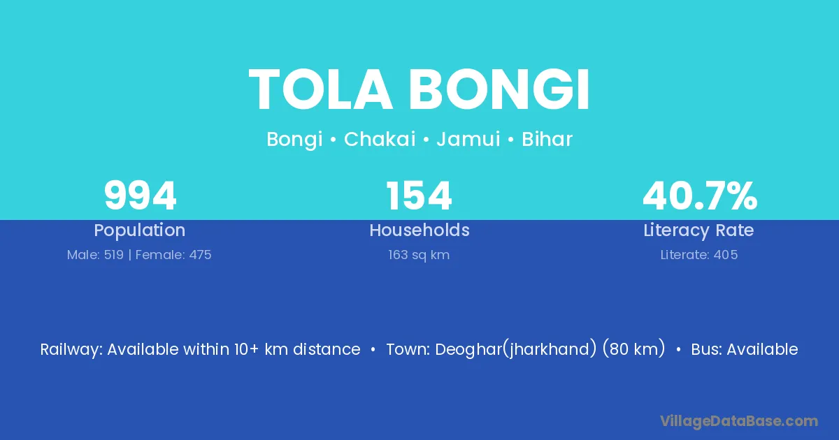 Deoghar(jharkhand) (80 km) is the nearest town to Tola Bongi village for major economic activities and is located approximately 80 km away.