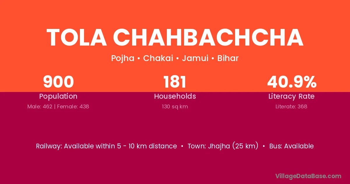 Jhajha (25 km) is the nearest town to Tola Chahbachcha village for major economic activities and is located approximately 25 km away.