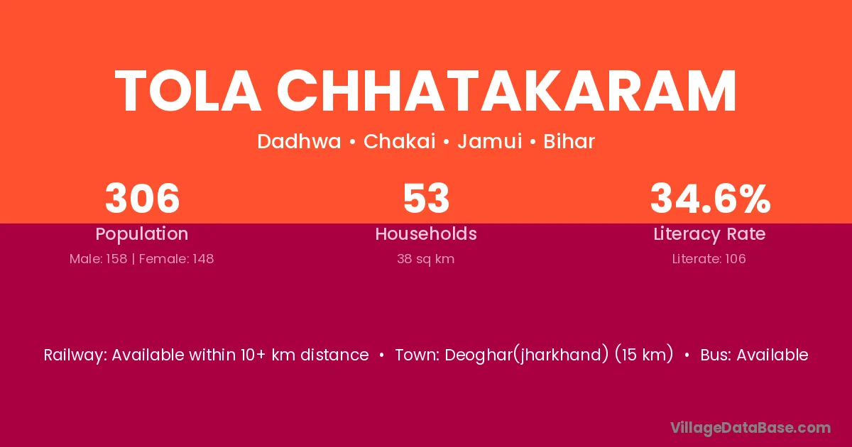 Deoghar(jharkhand) (15 km) is the nearest town to Tola Chhatakaram village for major economic activities and is located approximately 15 km away.