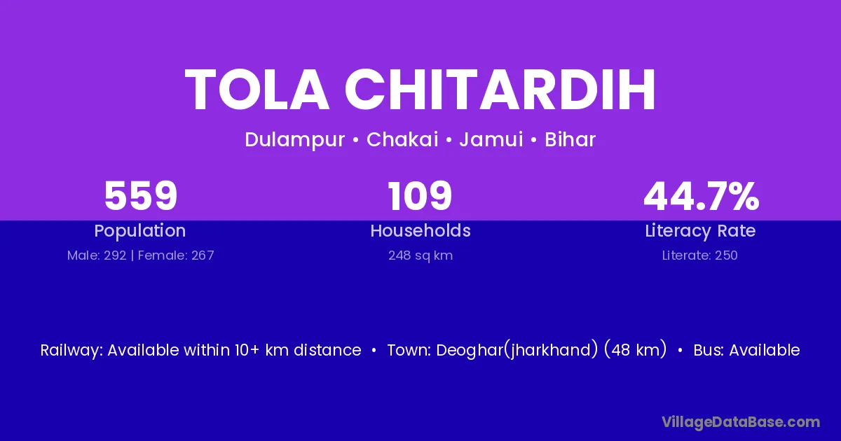 Deoghar(jharkhand) (48 km) is the nearest town to Tola Chitardih village for major economic activities and is located approximately 48 km away.