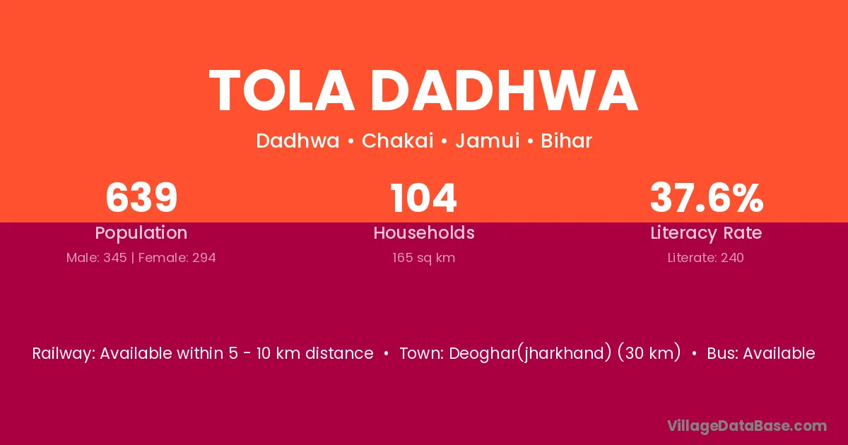 Deoghar(jharkhand) (30 km) is the nearest town to Tola Dadhwa village for major economic activities and is located approximately 30 km away.