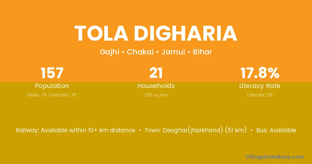 Tola Digharia village has a total population of 157 people, of which 79 are males and 78 are females.