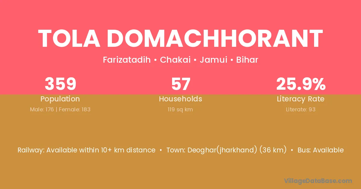 Deoghar(jharkhand) (36 km) is the nearest town to Tola Domachhorant village for major economic activities and is located approximately 36 km away.