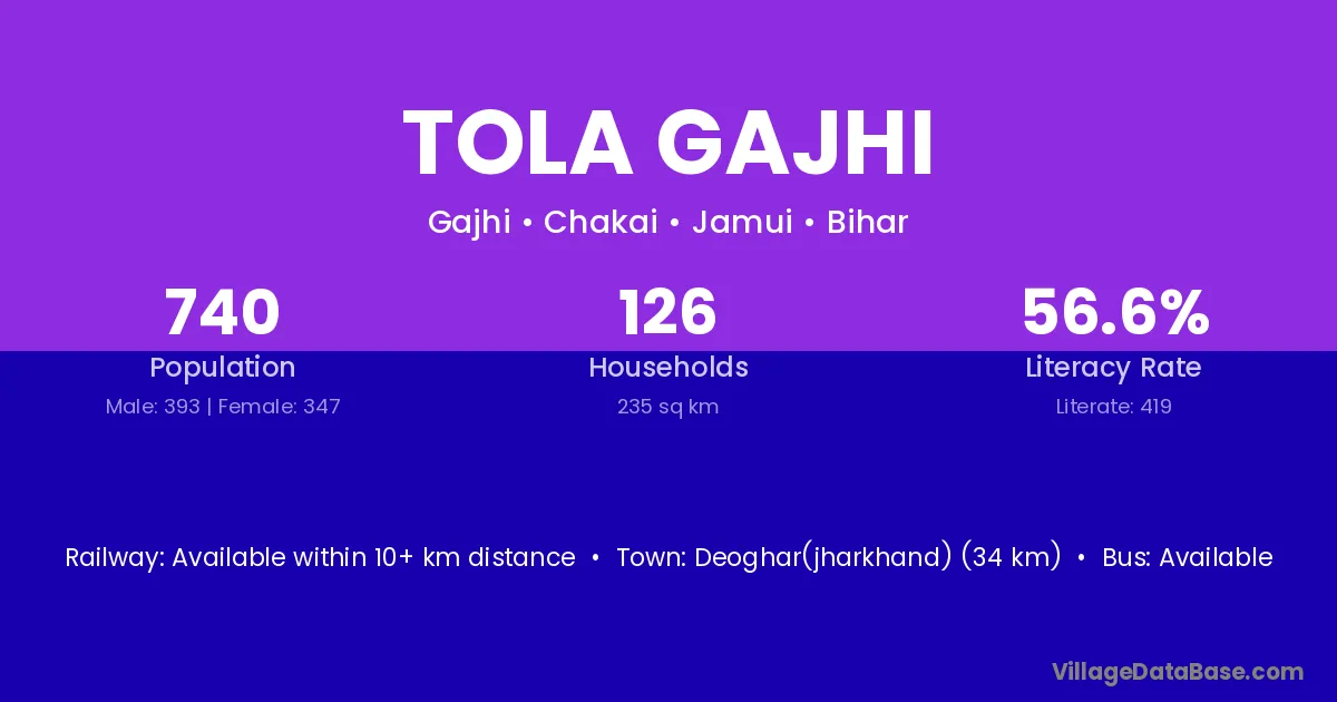 Tola Gajhi village has a total population of 740 people, of which 393 are males and 347 are females.