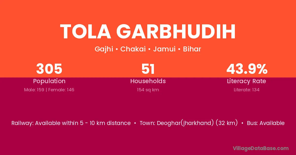 Tola Garbhudih village has a total population of 305 people, of which 159 are males and 146 are females.