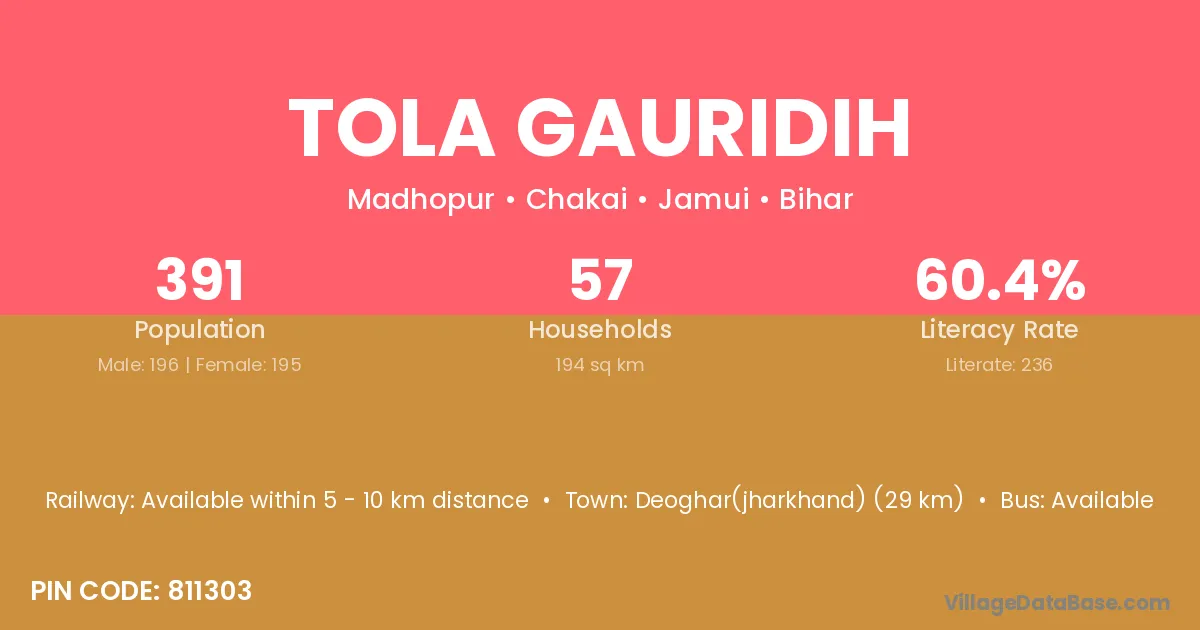 Tola Gauridih village has a total population of 391 people, of which 196 are males and 195 are females.