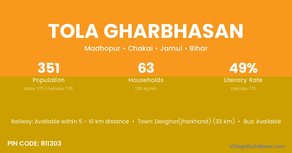 Deoghar(jharkhand) (33 km) is the nearest town to Tola Gharbhasan village for major economic activities and is located approximately 33 km away.