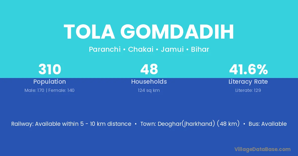 Tola Gomdadih village has a total population of 310 people, of which 170 are males and 140 are females.