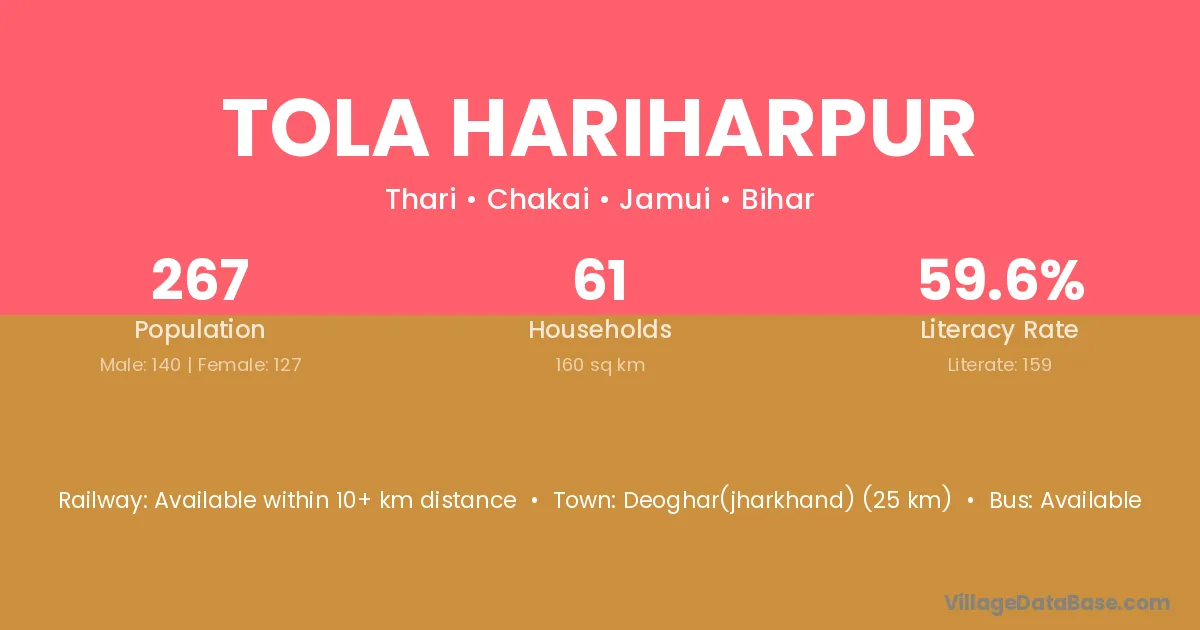 Deoghar(jharkhand) (25 km) is the nearest town to Tola Hariharpur village for major economic activities and is located approximately 25 km away.