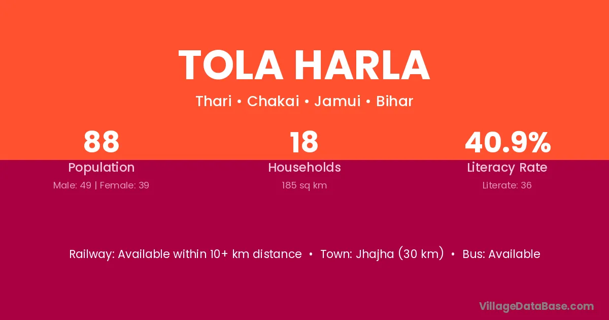 Jhajha (30 km) is the nearest town to Tola Harla village for major economic activities and is located approximately 30 km away.