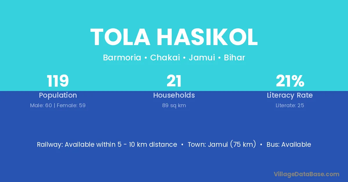Jamui (75 km) is the nearest town to Tola Hasikol village for major economic activities and is located approximately 75 km away.