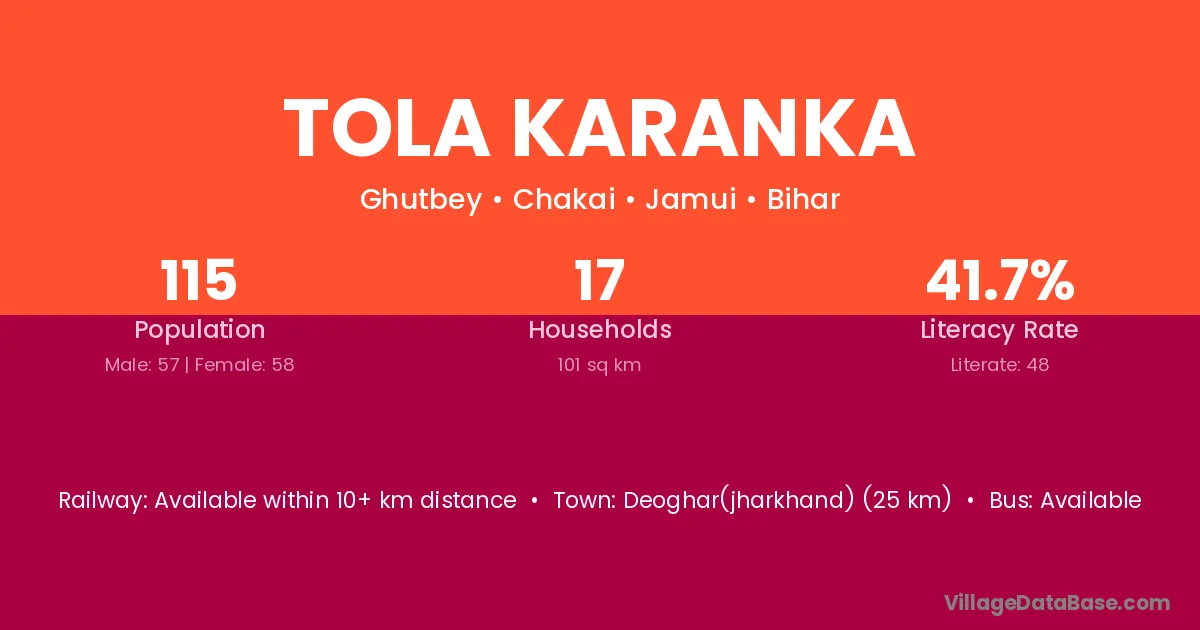 Deoghar(jharkhand) (25 km) is the nearest town to Tola Karanka village for major economic activities and is located approximately 25 km away.