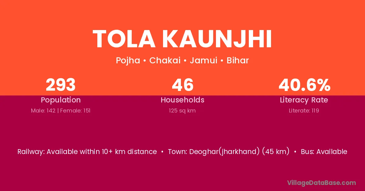 Tola Kaunjhi village has a total population of 293 people, of which 142 are males and 151 are females.