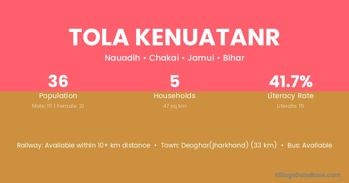 Deoghar(jharkhand) (33 km) is the nearest town to Tola Kenuatanr village for major economic activities and is located approximately 33 km away.