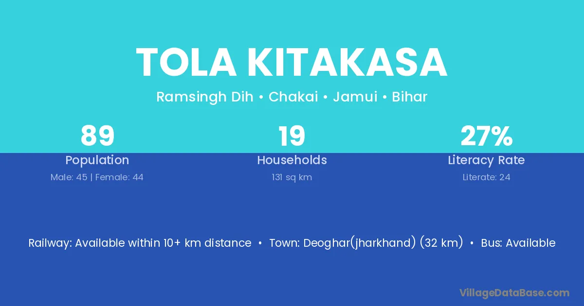 Deoghar(jharkhand) (32 km) is the nearest town to Tola Kitakasa village for major economic activities and is located approximately 32 km away.